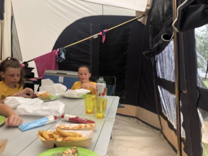 Omdat het regenen niet bij een kort buitje bleef besloten om even alleen naar voren te lopen om patatjes met een snack te halen voor ons allen. De innerlijke mens moest namelijk ook gevoed worden. Het is even een beetje behelpen met 5 mensen in de voortent zonder extra luifel eraan, maar het paste wel. Het was eigenlijk gewoon heel erg knus. En daar zit je dan dus met 4 tiener meiden die heerlijk aan het smikkelen zijn waarbij de een nog langzamer eet dan de ander. Ik dacht dat Elina al een langzame eter was maar ze heeft vriendinnen die het langzaam eten blijkbaar uitgevonden hebben. Tegen de tijd dat ze allemaal klaar met eten waren was de regen gelukkig wel al gestopt. Klein voordeel van het lang doen over een patatje met snack.