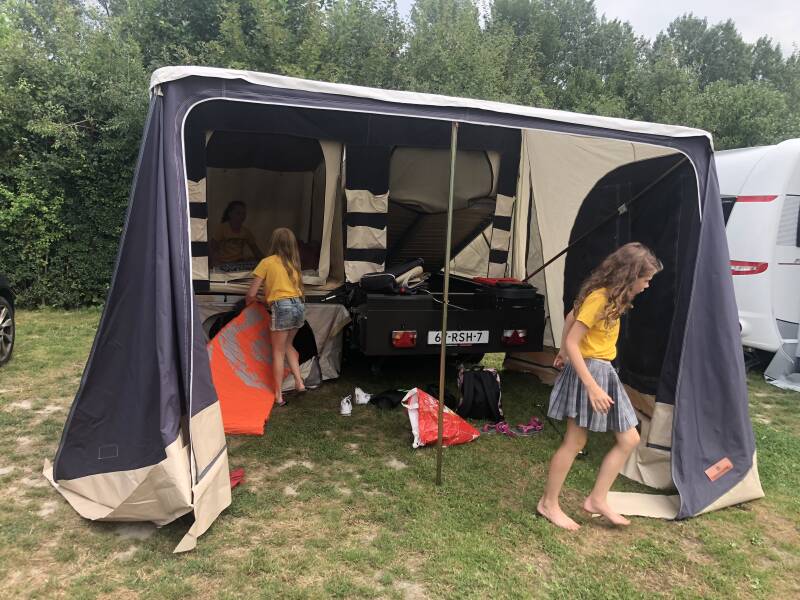 Na het loskoppelen van de wagen hem eerst maar eens op zijn plaats zetten. Ik moet zeggen dat ging echt heel gemakkelijk. Zo met z'n 5jes hadden we hem zo op de plek staan waar ik hem wilde hebben. Onder toezicht van onze buurvrouw en overbuurvrouw gingen we als een malle. Hij stond niet waterpas dus even een blok onder 1 van de wielen en ook dat hadden we samen eigenlijk zo gepiept. Dus even een schouderklopje voor ons zelf. Dat was stap 1. Inmiddels zagen we in de verte de dreigende wolken al ontstaan. Dus hup snel verder. Dekzeil eraf, poten uitdraaien (dat wilde de meiden doen) en toen konden we de kar open gaan klappen. Ik was bang dat we hier het heel zwaar mee zouden gaan krijgen maar zelfs dat ging vrij soepeltjes. Ik heb hem in mijn eentje bijna helemaal rechtop weten te krijgen, zo konden de meiden het tweede bed tegen houden zodat ik hem vervlgens voorzichtig naar beneden kon laten zakken. En zo stond deel 1 van de vouwwagen al klaar. Na het waterpas zetten van het bed van de meiden moesten we de wagen opentrekken. Oja vergat ik bijna het T stuk er tussen te plaatsen. Dat is normaal Rick zijn klusje dus ook niet helemaal gek. ik vond al dat hij zo gek om hoog kwam haha. Maar goed snel alsnog dat T stuk ertussen en toen was de voortent zo naar voren getrokken. En toen zat het werk van de meiden er al op. Terwijl ik de tussen stok er in heb gezet konden zij al vast de spullen uit de auto plukkken en hun slaapvertrekken instaleren.