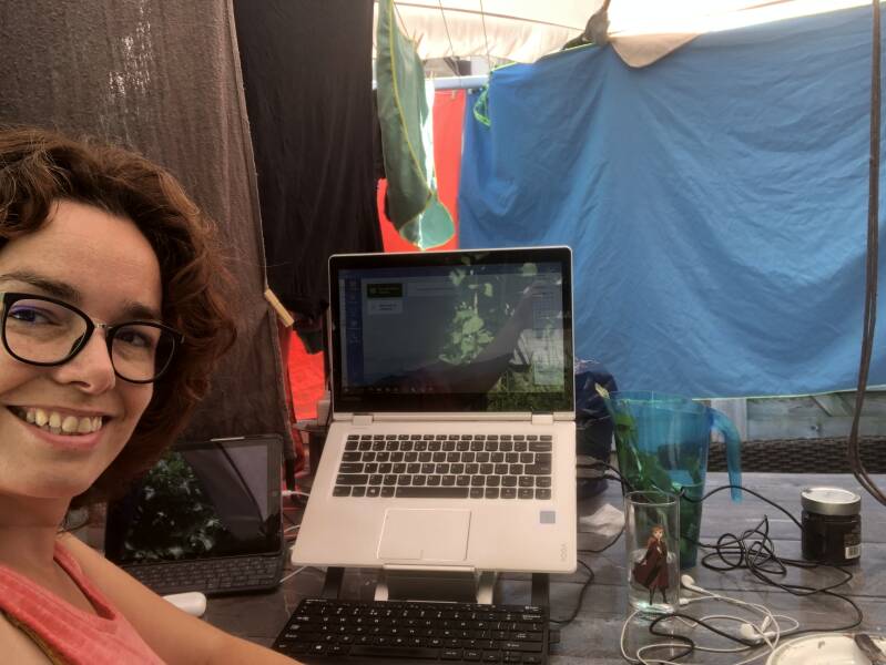 Toch moest er wel gewoon gewerkt worden, dus hoe dan wel. Ik heb van alles geprobeerd. Binnen met alle gordijnen en de zonneluifel naar beneden, buiten in de tuin onder de parasol maar waar ik ook ging zitten het zweet brak uit alle poriën van mijn lijf uit. Uiteindelijk was de meest prettige manier om in de ochtend om 7:00 te beginnen met werken. Dan buiten de parasol op zetten en het droogrek. Daar allemaal handdoeken ophangen zodat mijn volledig werk plek in de schaduw viel. Het af en toe lekkere zee windje maakte het dan nog enigzins aangenaam. Oké nog steeds te warm om netjes aangekleed te gaan zitten dus maar op de slippertjes en in bikini en dan als ik een conference call had snel een hemdje of blousje eroverheen. Een vakantie gevoel en werkgevoel in één. Er miste alleen een lekker zwembad om in af te koelen. Dus dan maar met de voeten af en toe in een emmer met koud water :-). En om de vochtbalans te blijven aanvullen kannen met water, ijsklontjes, eigen gekweekte munt, citroen en limoen erin. Zo was het nog best prima vertoeven. En doordat ik de poort dicht hield en binnen alle gordijnen dicht had niemand door dat ik thuis was en kon ik dus ook nog ongestoord door werken.