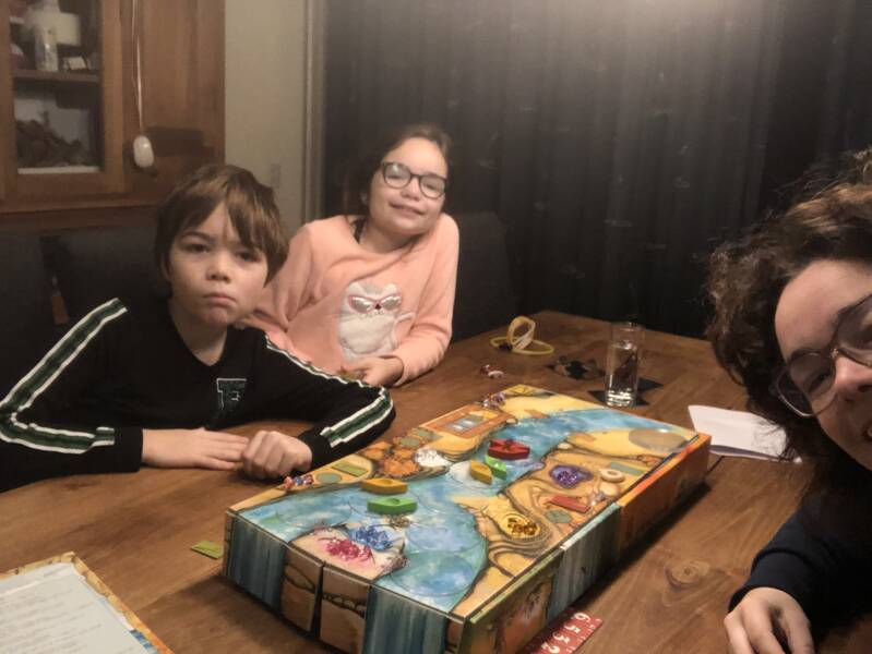 Woensdag ochtend was het zoals eigenlijk al de hele week druilerig, koud en dus somber weer. Ik moet zeggen dat werkt niet echt bij aan het vrolijk opstaan. Daarnaast zat me de 'strijd' dag van de dag er voor nog behoorlijk dwars. Gelukkig voelde de kinderen wel dat ze het vandaag niet te bond moesten gaan maken. Ze hadden allebei al braaf gegeten en gedronken toen ik beneden kwam en ook waren ze al aangekleed. Dat was in ieder geval al een redelijk goed begin van die ochtend. Deze dag gelukkig ook geen problemen bij het inloggen. We hebben daardoor gemerkt dat als we inloggen voor 8:30 er in ieder geval geen problemen zijn. Dat houden we er dus in. Meteen na het opstaan al vast inloggen en daarna eten, drinken en aankleden. na het schoolwerk en mijn eigen werk afgerond te hebben even samen geluncht en toen op naar de bakker en mijn schoonmama. Want de wekelijkse broodbestelling moest weer worden afgeleverd. Zoals iedere week werd er door de kinderen een aanval ingeet op de schaal met chocolaatjes van oma. Het lijkt wel of ze thuis niets krijgen maar ach volgens mij zijn alle kinderen het zelfde haha. Er hoeft maar iets lekkers op tafel te staan en de oogjes zijn direct gefocust op dat lekkers net als bij honden die direct gaan kwijlen. Gelukkig voor mijn kinderen is mijn schoonmoeder erg makkelijk en mogen ze dus ook meteen aanvallen en dat weten ze maar al te goed. Vervolgens ploffen beide lichamen op de bank van oma, de afstandbediening wordt er bij gepakt en binnen 1 minuut na binnenkomst staat netflix of youtube al aan op de TV. En als mijn schoonmama en ik dan een gsprek proberen te voeren wordt het geluid steeds harder gezet tot wij zeggen dat hij weer zachter moet. Dat is echt een wekelijks ritueel aan het worden. eigenlijk best lachwekkend nu ik het zo opschrijf. Misschien moet ik volgende week maar eens gaan invoeren dat ze verplicht eerst moeten gaan zitten, met oma moeten babbelen en dan pas een chocolaatje mogen paken en de TV aan mogen zetten. Eens kijken of ik dat er in krijg. Ik cht de kans 0,5% moet ik zeggen. Zeker omdat mijn schoonmama het wel allemaal prima lijkt te vinden zoals het nu gaat haha. Omdat de kinderen zich verder echt heel erg goed hebben gedragen heb ik aan het eind van de dag het spel Iguazu er maar eens bij gepakt. Een spel wat ik via mijn vriendin Esthet al wel vaker heb gespeeld en daarom tweede hands ook maar eens op de kop heb getikt. De kinderen vonden het een super leuk spel en we hebben er zefs een timelaps filmpje van gemaakt.
